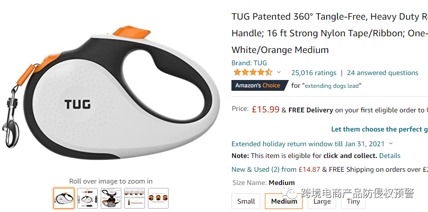 就是下面这款延伸狗绳,目前是亚马逊英国站的Amazon's Choice,现有留评数25016,根据尺寸不同,售价在14.99-19.99英镑: