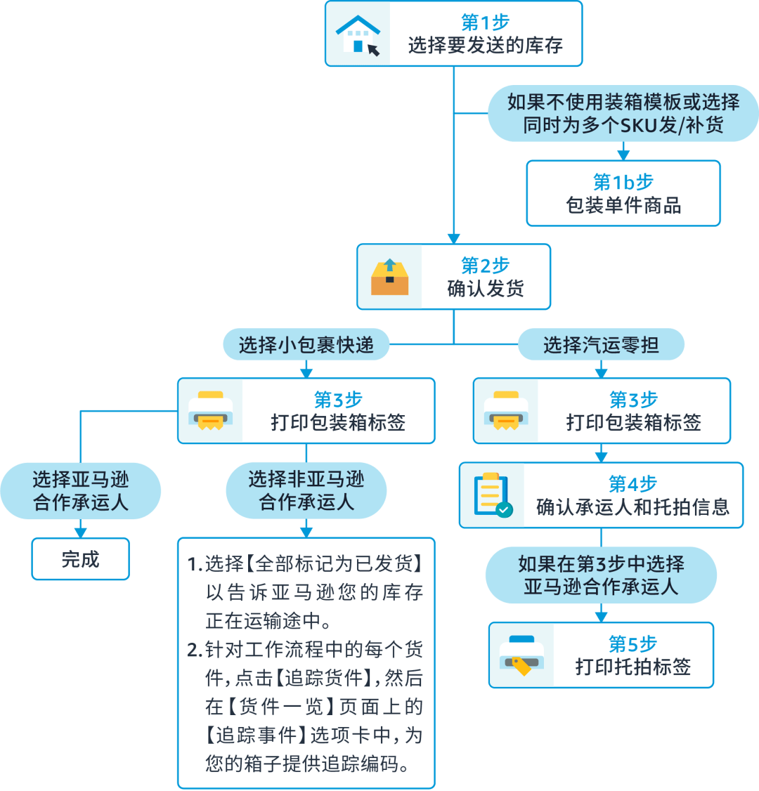 根据所在的站点及创建货件时所做的选择,卖家看到的步骤可能有所不同,大致步骤如下: