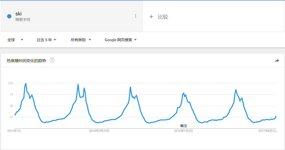根据谷歌趋势显示,ski这个大词的热度在每年冬季都有明显的上涨。节日类产品有一定的风险性,过节后便无人问津,而滑雪类产品则是走俏整个旺季。