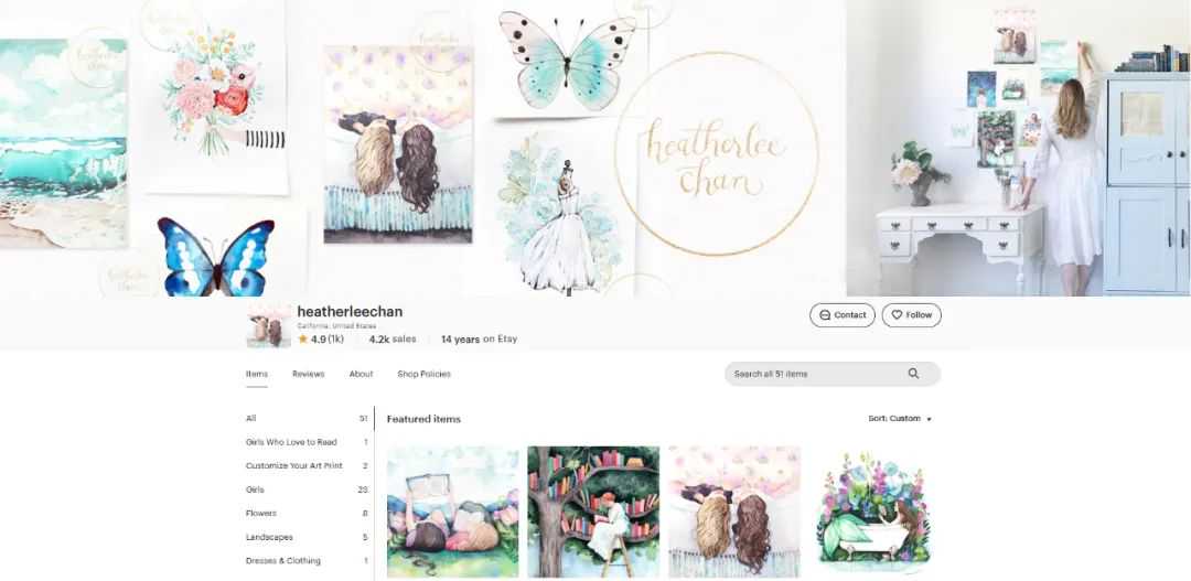 她的画作不仅以艺术印刷品形式出售,还授权应用于家居用品、文具、贺卡、陶瓷等产品,在HomeGoods、TJ Maxx等连锁商店都能找到,Heatherlee Chan的作品风格辨识度极高,深受喜爱复古浪漫风的粉丝追捧。此外,她曾为Klutz出版社绘制畅销水彩涂色书《Watercolor Crush》。