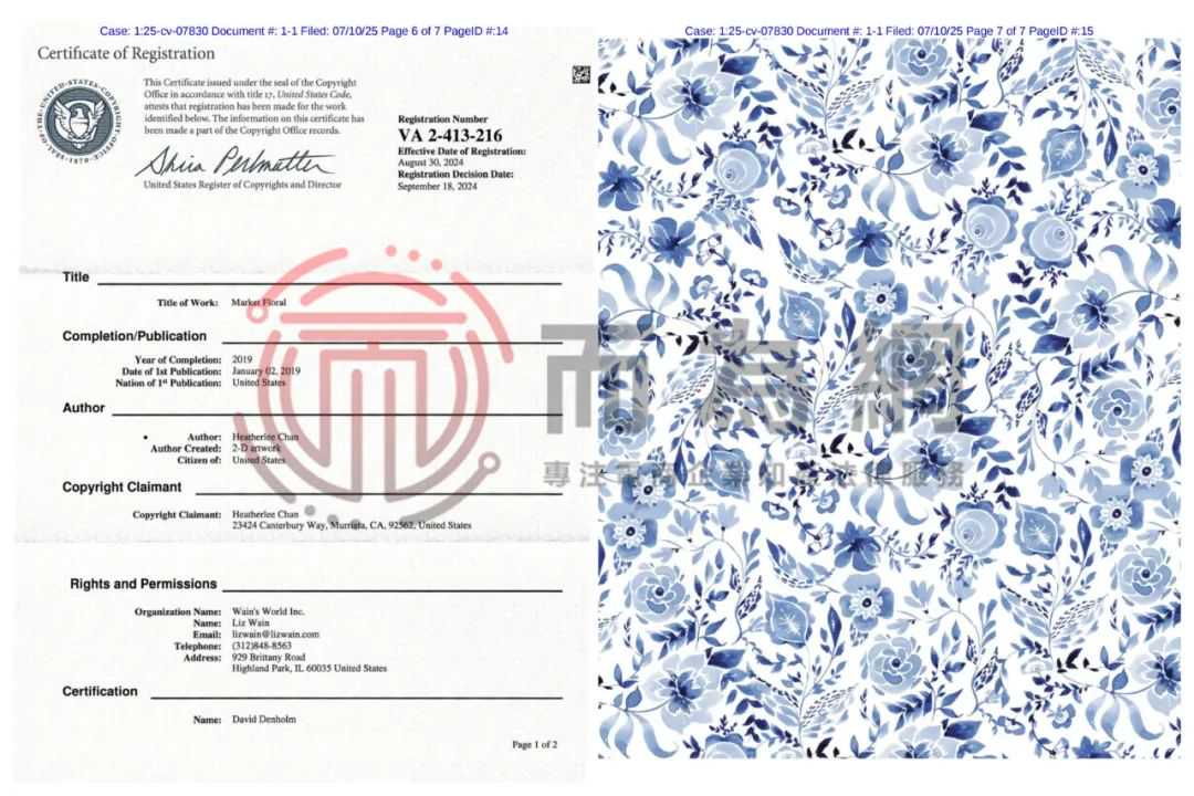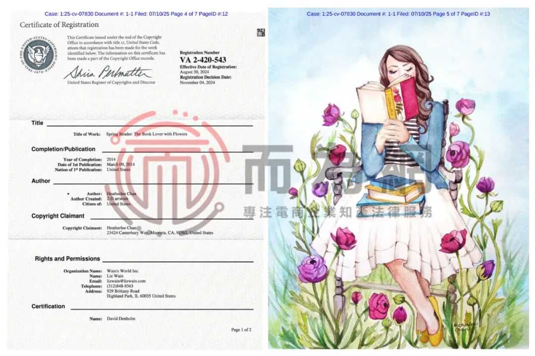 原告Heatherlee Chan在6 月 25 日发起过维权(案件号:25-cv-7060),当时仅一张图。本案涉及的版权信息如下,共3张图片,未经授权以下图片及原告官网的其他作品都不能擅自使用,否则会有侵权风险!