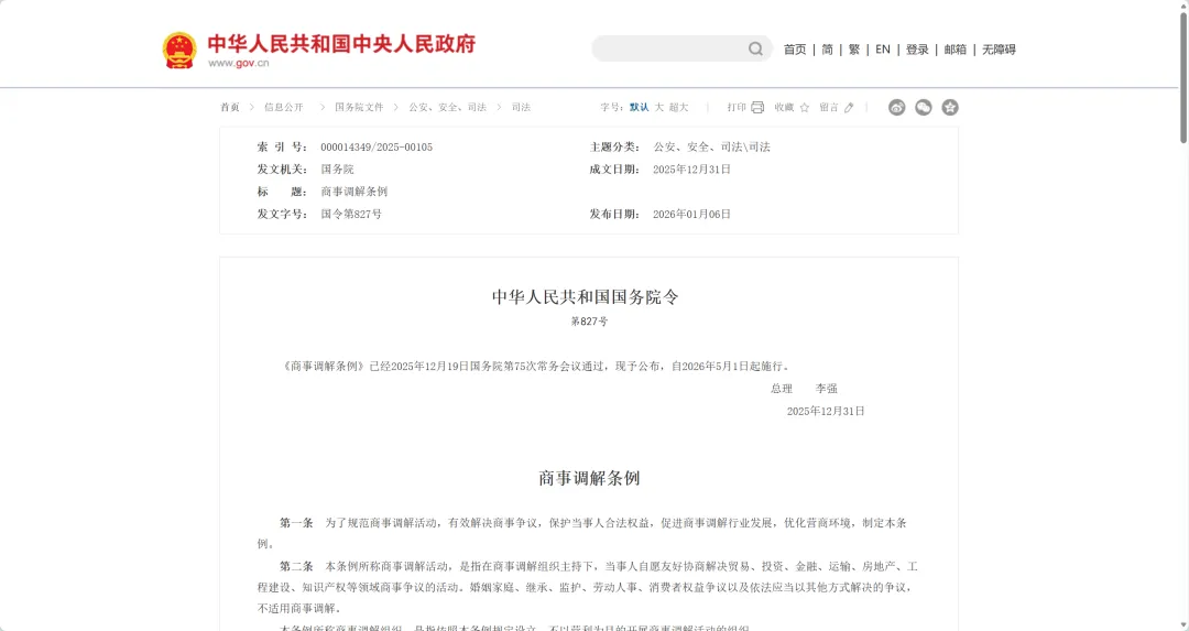 2025年12月31日,国务院总理李强签署国务院令第827号,正式公布《商事调解条例》(以下简称《条例》),该条例将于2026年5月1日起正式施行。作为我国首部专门规范商事调解活动的行政法规,《条例》的出台填补了商事调解领域制度空白,为解决贸易、投资、金融等领域商事争议提供了更高效、更专业的路径,对优化市场化法治化国际化营商环境、服务高质量发展和高水平对外开放具有重要意义。
