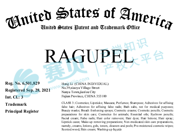 HE GALLEON GUILD LTD 是家英国私人有限公司,核心业务全围绕 RAGUPEL 商标转,专门做第 3 类美妆个护及相关产品。早在 2020 年 11 月,它就把RAGUPEL 商标用在商业活动上了,还在 2021 年 9 月成功在美国专利商标局注册,注册号是 6,501,829,拿到了第 3 类商品的排他使用权,这法律基础可是相当扎实。