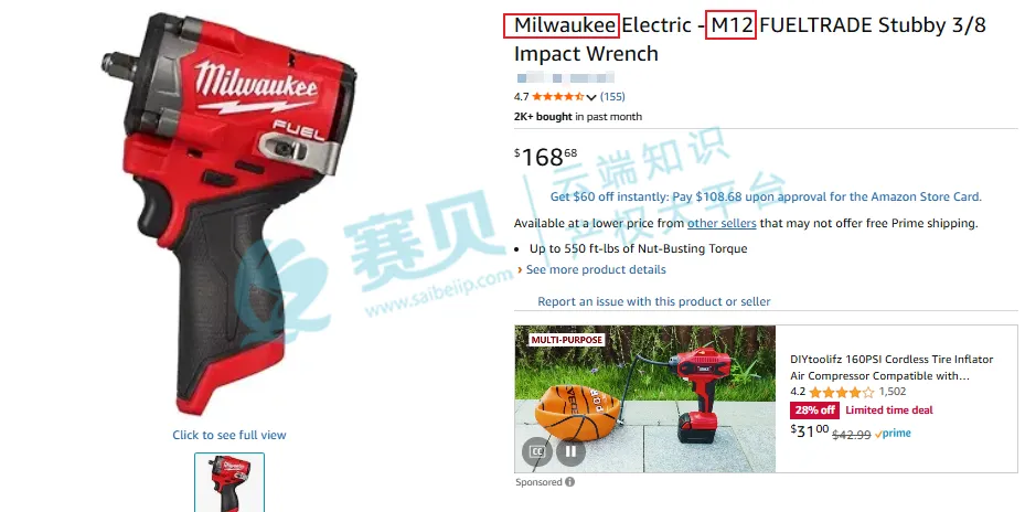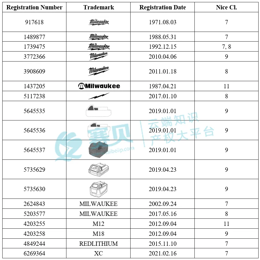 ① 文字商标:不仅 “MILWAUKEE” 本身是商标,“M12”“M18”“REDLITHIUM” 等系列型号也已注册,涵盖工具、电池、服装等多个品类,很多卖家误以为是通用型号,随意用于产品标题或描述,直接构成侵权;