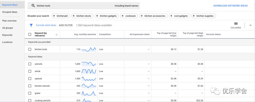 比如,我搜索厨房用具,就会得到以下的结果。你会发现,从厨房用品衍生出来的一些英语单词, 你可能见都没见过。每一个词都有可能是一个细分市场,具备不同的潜力。从一些小规模的市场开始,对于刚刚起步的卖家来说,其实是一个不错的起点。