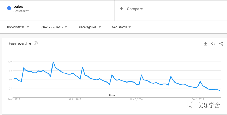 使用Google趋势(Google Trends)来查看搜索字词的效果。比如输入关键词- paleo,然后点击“搜索字词”。你可以看到过去几年内蛋白质棒的趋势,那些降低和飙升的趋势是来自于人们在感恩节和圣诞节期间,有圣诞大餐可以吃,自然就失去对能量棒的兴趣,然后兴趣再次在新年后飙升。