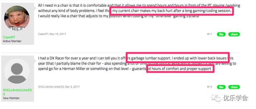同样,我们的目标是找到有关流行产品不同功能的具体反馈。在一个游戏座椅的论坛上,腰痛是被抱怨最多的。