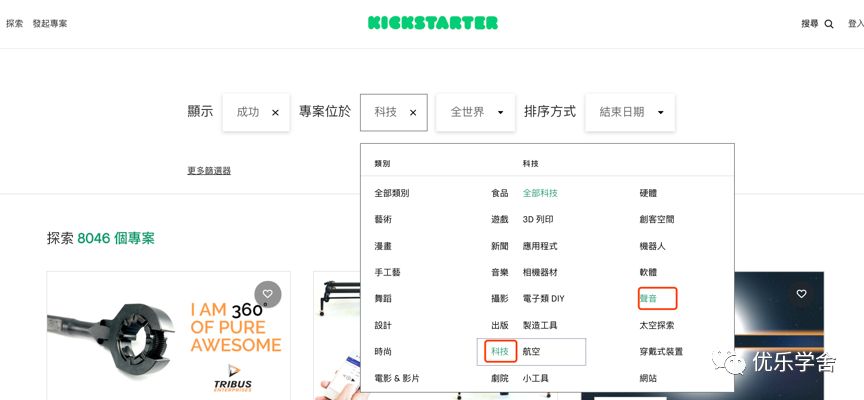 接下来,选择如何对广告系列进行排序。我建议按支持者最多的排列顺序。你也可以按资金最多的方式进行排序,指承诺给到项目最多资金总额的。您将获得在Kickstarter平台上取得大量众筹成功的产品,而这些产品的介绍则可以为你的网店提供大量创意。