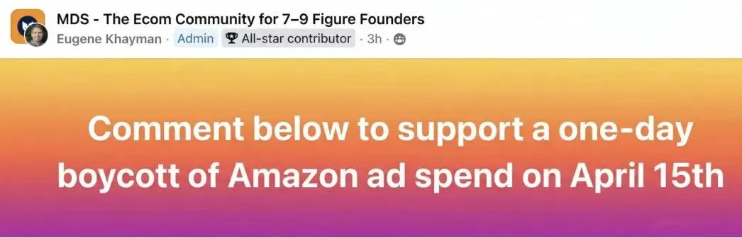 面对双重调整带来的运营压力,全球亚马逊卖家的不满情绪迅速积聚,最终引发了4月15日的全球停投行动。此次抗议并非零散的个体抱怨,而是有组织、有规模的集体发声,核心发起者“Million Dollar Sellers”社群由700多名年销售额超百万美元的卖家组成,最初仅有100余名卖家响应,随后支持者快速增至150人,参与者均计划在4月15日当天暂停所有广告投放,并发布截图证明其行动,以此向亚马逊表达诉求。