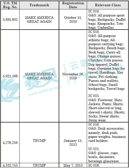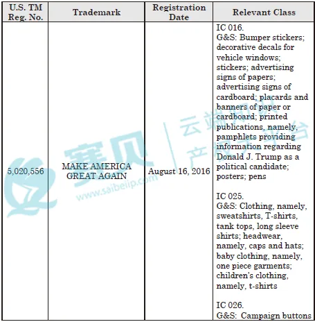 案件涉及两类商标:“TRUMP” 系列,小到桌垫、镇纸、名片夹这些办公用品,中到玻璃杯、碗、醒酒器之类的餐具,大到帽子、T 恤、卫衣、运动鞋等服装,甚至连政治宣传相关服务都涵盖了。而 “MAKE AMERICA GREAT AGAIN” 系列更贴近日常销售,服装类从成人卫衣、T 恤到婴儿服饰都有,配饰里帽子、背包、雨伞应有尽有,连宠物服饰都没放过,还有贴纸、海报、竞选徽章这些宣传品也在保护范围内。