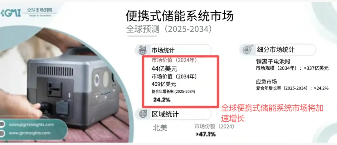 据Global Market Insights的数据,随着露营、徒步等户外活动的流行,全球便携式储能系统市场规模预计将从2024年的44亿美元飙升至2034年的409亿美元,年复合增长率高达24.2%。