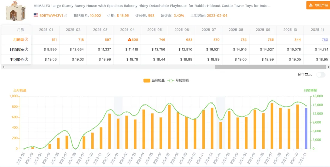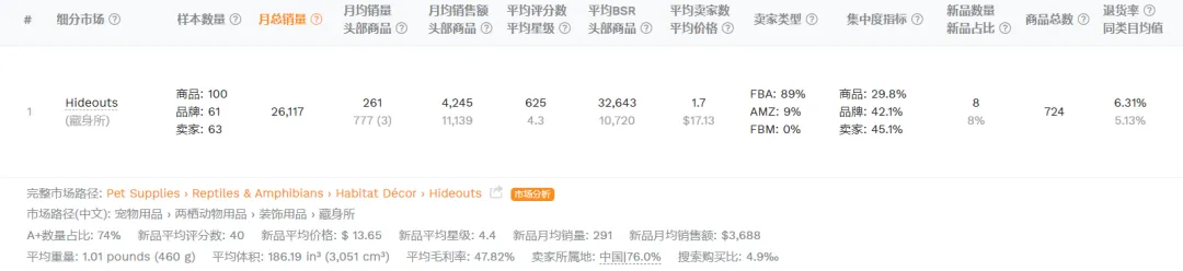 分析完产品,再回头分析一下类目的情况,BS类目月销接近3万的销量,商品集中度比较低,而品牌集中度和商家集中度相对较高,新品销量占比比较低,只有4.65%,细看BS榜单的产品,很多和兔子的房子不相关,是玩具之类的,占比也有近30%,单纯看这个数据,这个类目的进入空间相对有限,对新手卖家不是很友好,还是那句话,市场如何,能不能做,和自己的能力,资源是否匹配,只有自己才最知道,冷暖自知!