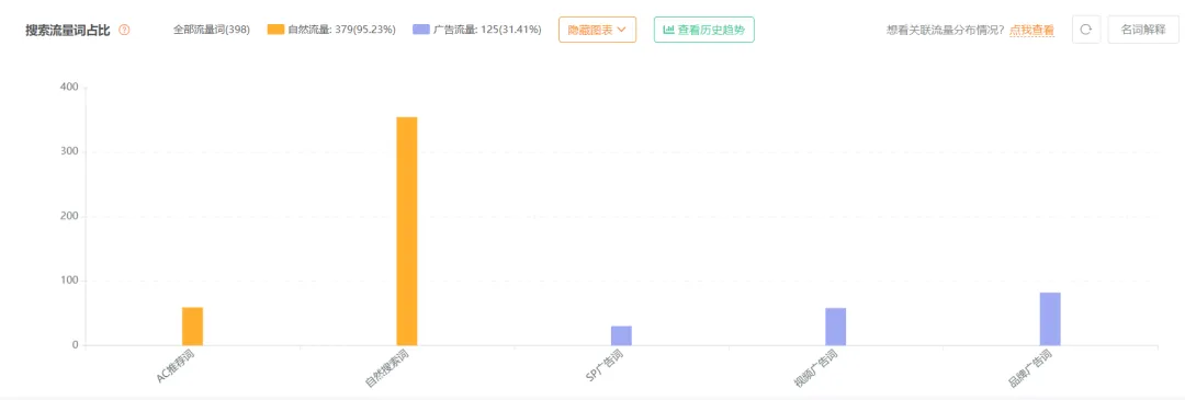 关键词方面通过卖家精灵查询,产品整体以自然流量为主,广告词流量占比较低,也是正常,因为产品已经稳定销售接近3年了。