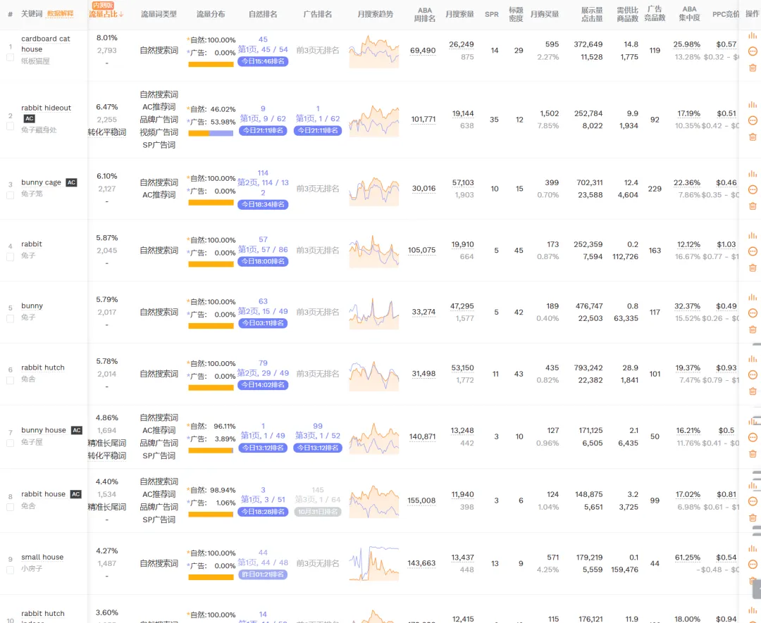 关键词中,还是有一些亮点的,其中关键词rabbit hideout兔子藏身处,带来6.47%的流量,PPC竞价0.57$,并且这个词是转化平稳词,bunny cage 兔笼,带来6.1%的流量,PPC竞价0.46$,是Amazon AC推荐词,bunny house 兔子房子,带来4.8%的流量,PPC竞价0.5$ ,是精准长尾词和转化长尾词。