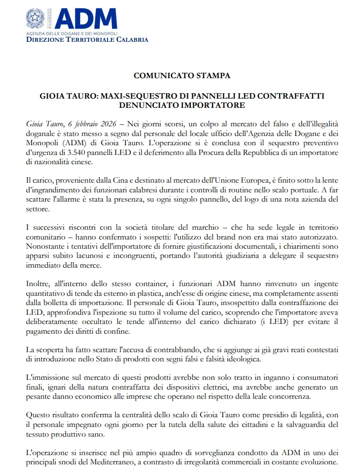 截至目前,被查扣的涉嫌假冒LED面板及瞒报商品均已被扣押,后续将由意大利海关按照相关程序进行进一步鉴定和处理。ADM表示,将持续加强对进口集装箱货物的监管力度,防止非法商品进入欧盟市场,维护合法贸易秩序和知识产权保护。