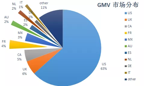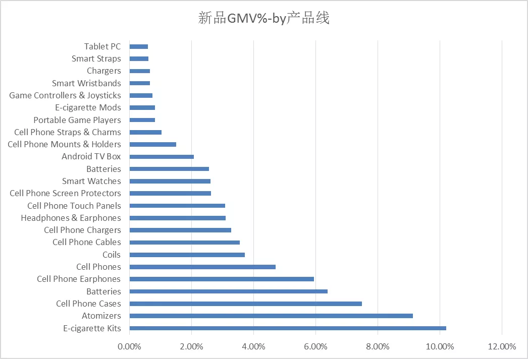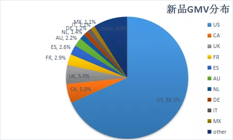 新品的市场较集中,其中美国、加拿大、英国、法国和西班牙,5个区域的GMV 占3C新品整体的84%。