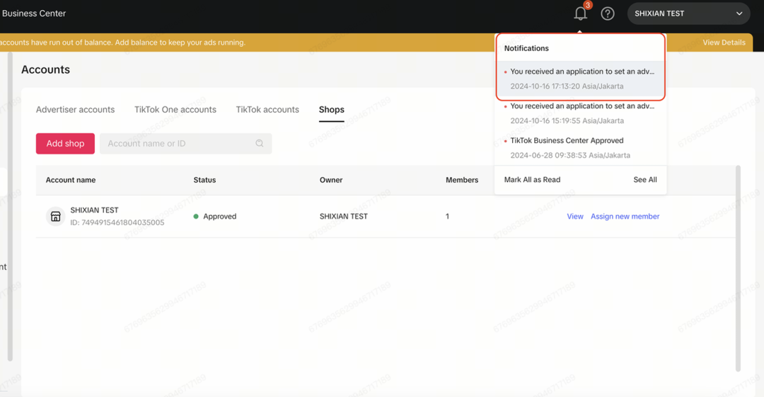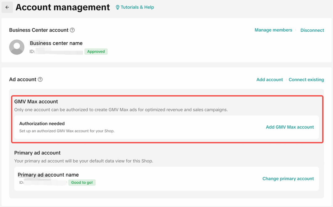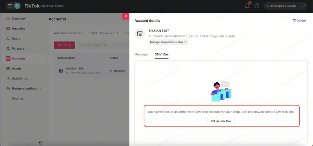 为了能够成功运行GMV Max,GMV Max ad account,TikTok accounts,和TikTok Shop需要在同一个BC中