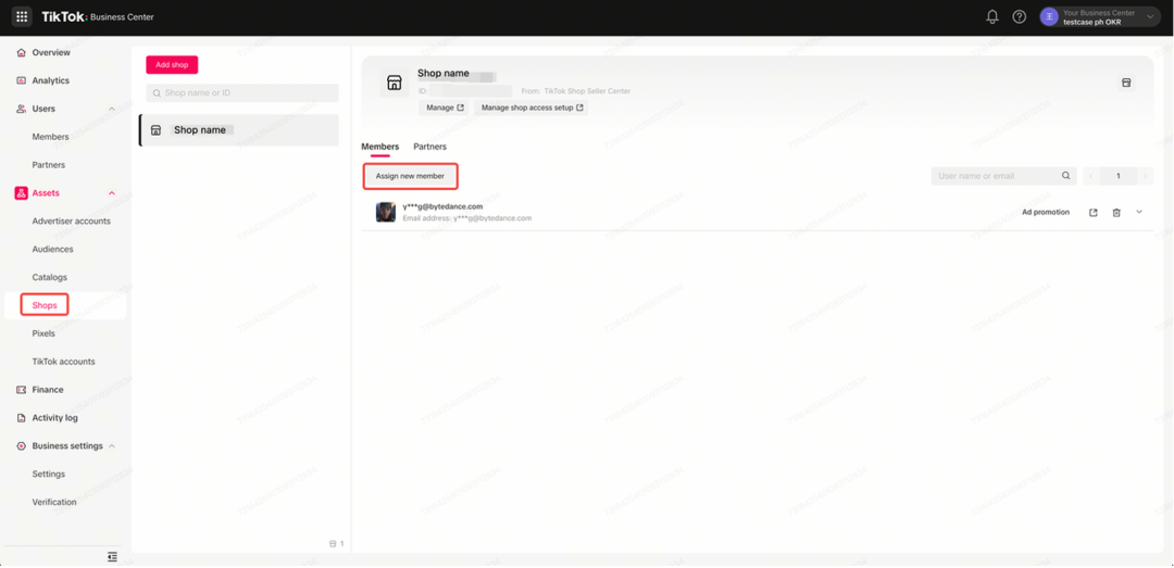 3、选择shop并点击Assignnewmember(分配新成员)来授予用户权限。