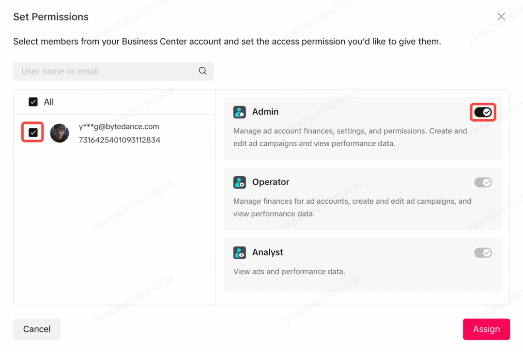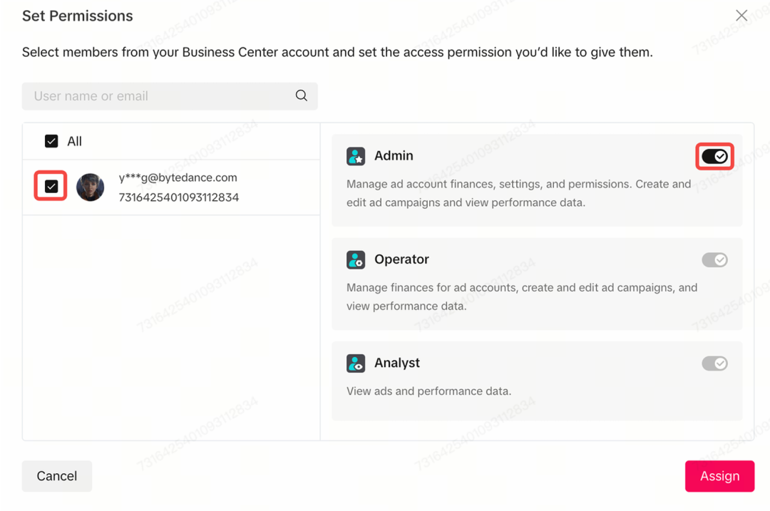 3、选择GMV Max ad account并单击Assignnewmember授予用户权限。