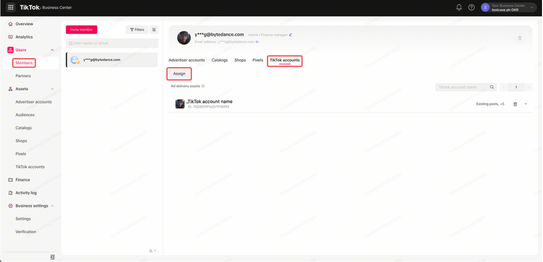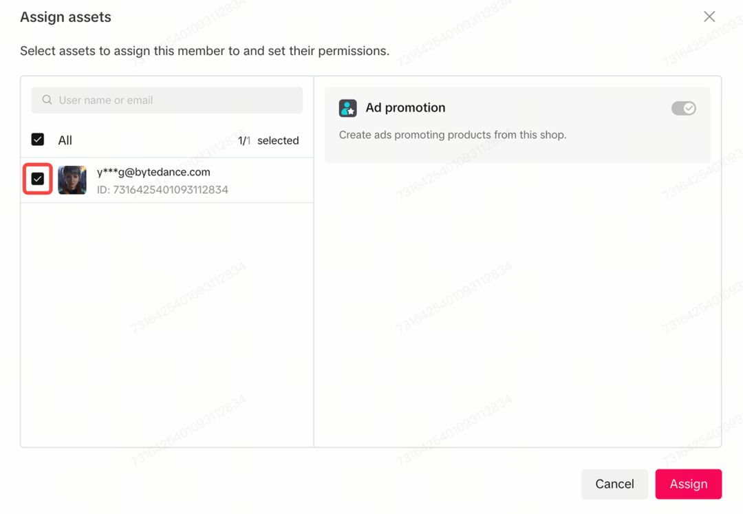 3、选择GMV Max 关联的ad account并点击Assignnewmemeber(分配新成员)来授予用户权限。