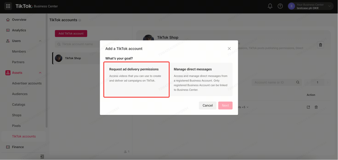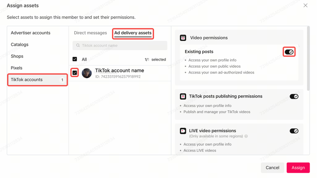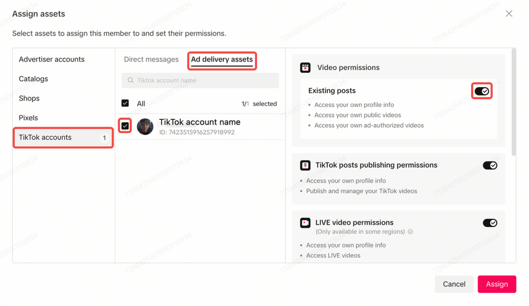 4、点击Addelivery assets并选择您想要向用户授予广告权限的TikTok账户;