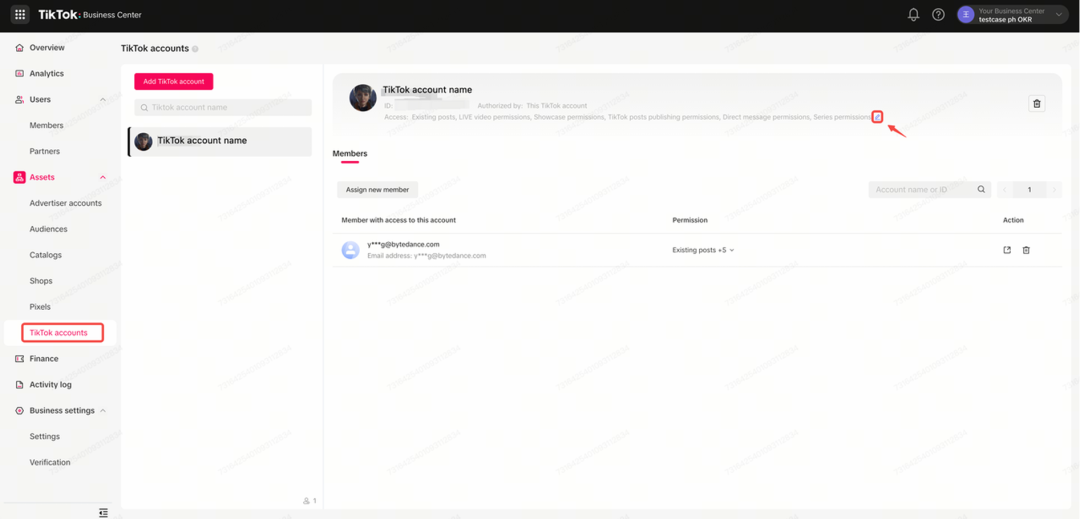 6、点击TikTok accounts页面,选择TikTok account并单击编辑图标来申请广告权限。