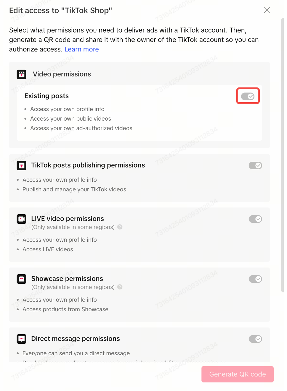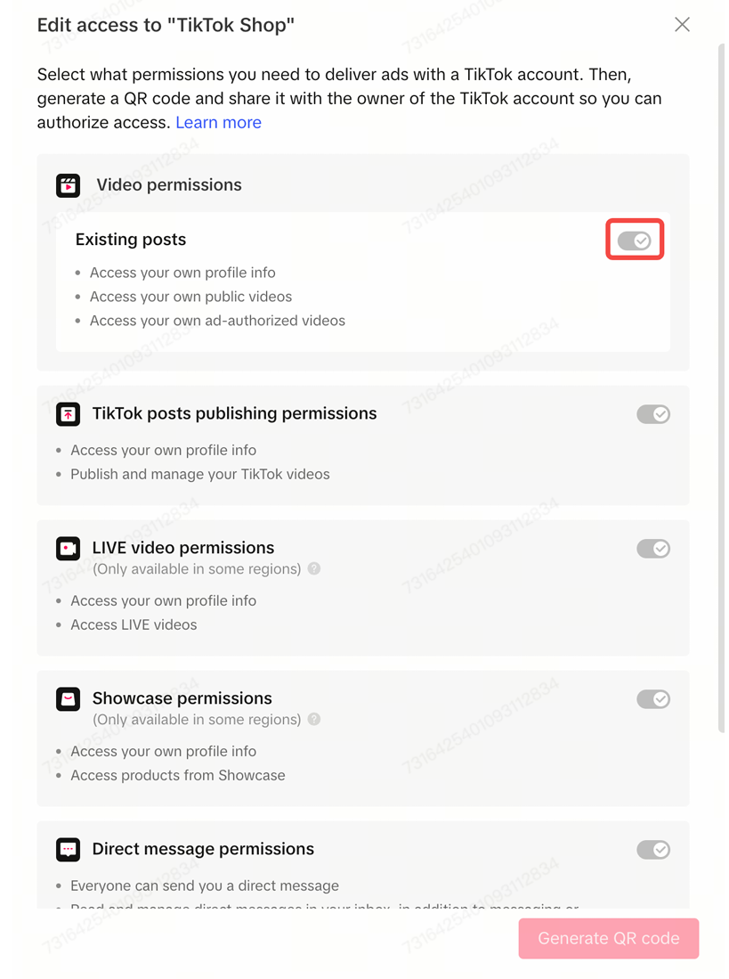5、如果您无法打开exitingposts(现有帖子)切换按钮来授予广告权限,则表示这些账户没有向shop授予完整的广告权限;