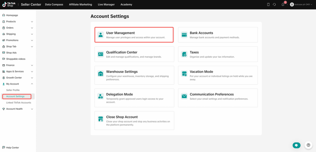 2、登录店铺的Seller Center,转到Account Settings页面,然后点击User Management;