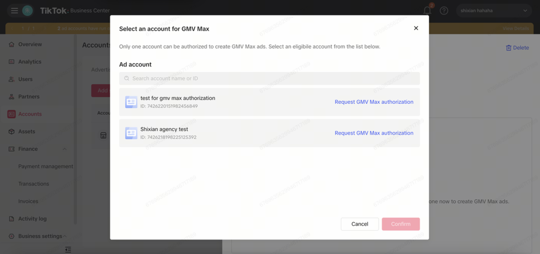 对于代理侧用户(Agency user),他们可以在GMV Max授权申请的过程中指定一个广告账户作为GMV Max account。