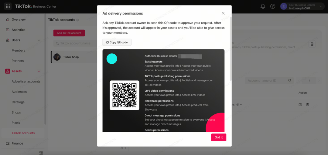 5、使用TikTok App扫描二维码给Business Center开通广告权限。