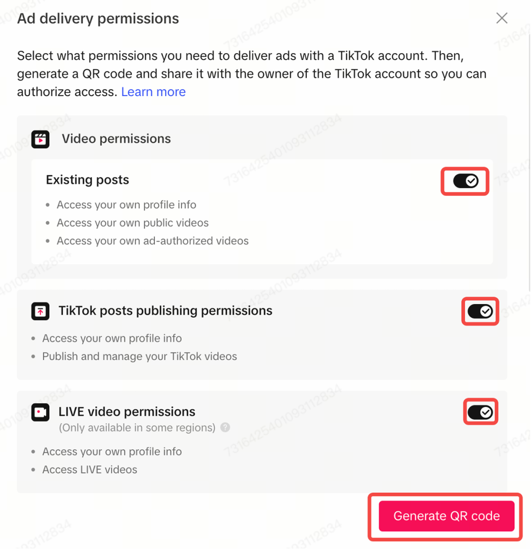 4、选择Request ad delivery permissions(申请投放广告权限),打开所有权限并生成二维码;