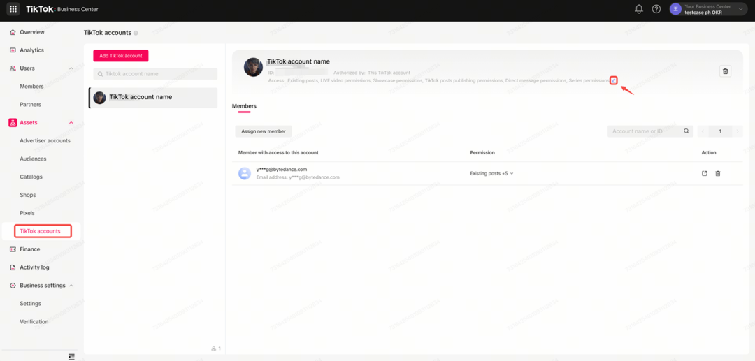 6、转到TikTok accounts页面,选择TikTok账户并单击编辑图标申请广告权限。