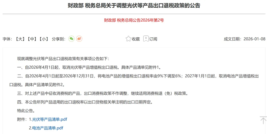 1月8日晚间,财政部、税务总局公告称,自2026年4月1日起,取消光伏等产品增值税出口退税。自2026年4月1日起至2026年12月31日,将电池产品的增值税出口退税率由9%下调至6%;2027年1月1日起,取消电池产品增值税出口退税。
