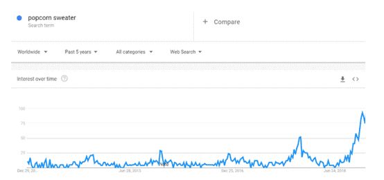 谷歌趋势显示popcorn(爆米花)的搜索量猛增,很可能成为2019服装品类的黑马。