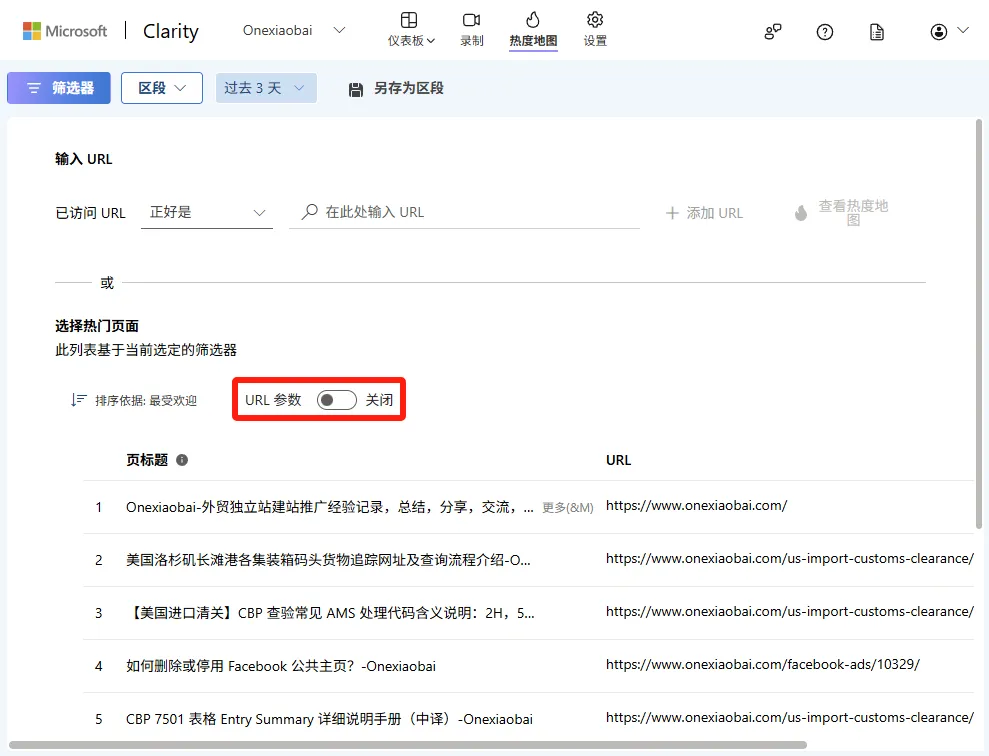 热门页面列表有一个 URL 参数切换按钮,切换 URL 参数并选择 URL 时,可以查看与该 URL 及其参数完全匹配的热图。关闭后,则会看到一个以指定值开头的热图,带或不带参数。