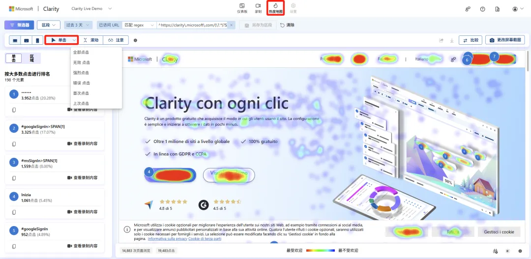 点击热图能帮助你确定用户在页面上点击的位置(包括非链接区域),了解用户点击最多的是页面的哪些部分。在 PC 端,Clarity 追踪用户点击行为(User clicks);在移动/平板设备上,Clarity 则追踪用户轻触操作(User taps)。
