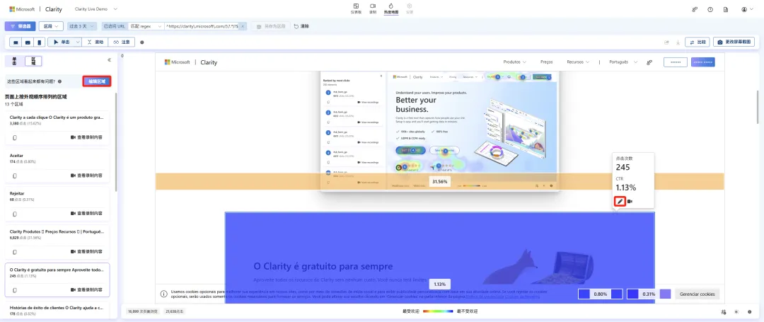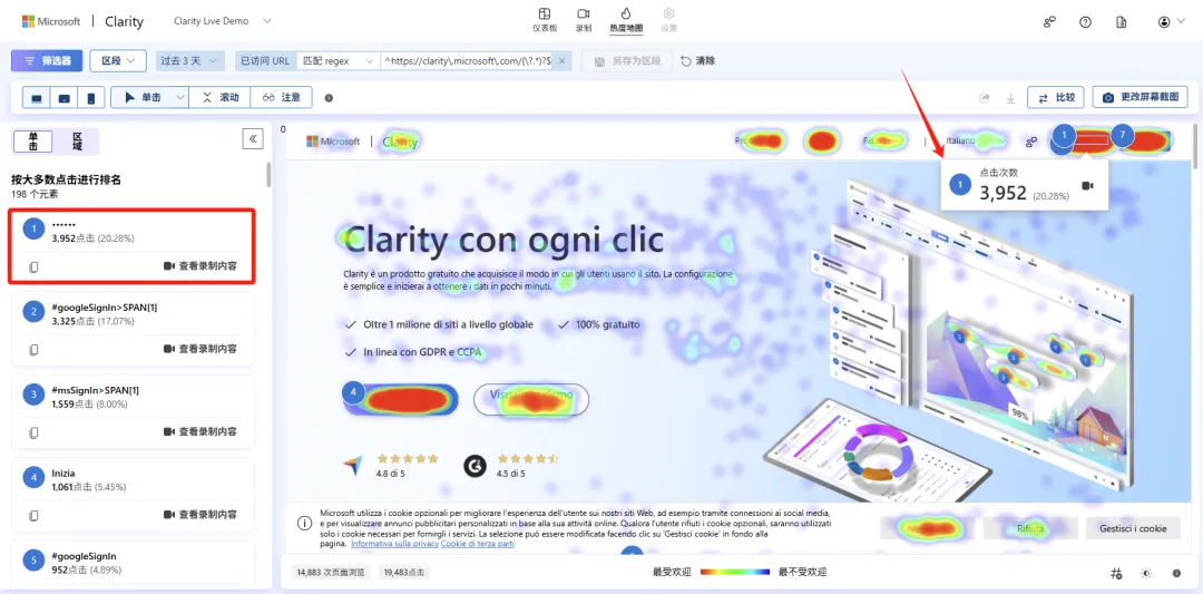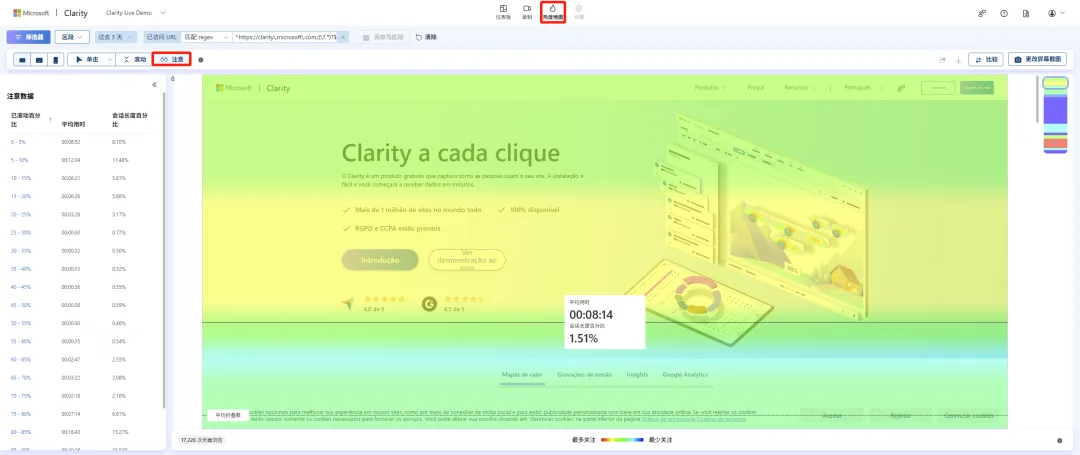 需要注意的是,Clarity 的热图是动态的,它根据不同时间点存在的元素呈现交互行为,这种灵活性可实现页面生命周期各阶段点击行为的可视化呈现。
