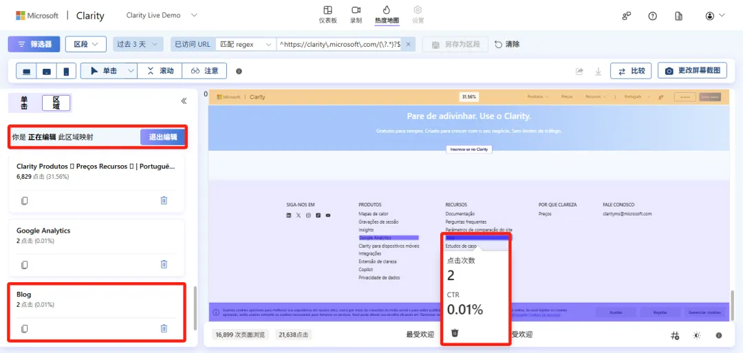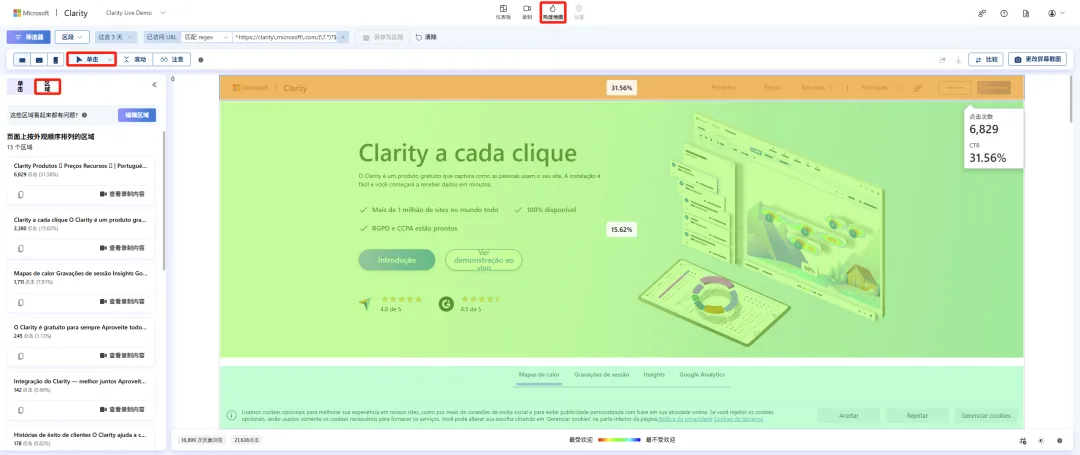 据 Clarity 团队介绍,由于区域热图在技术上属于“点击热图”的一种,因此经调整后,区域热图现在的新位置位于“点击热图”模块的左侧面板中,