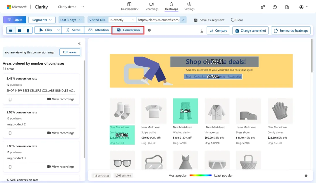 Clarity 中有五种主要类型的热图:点击热图、滚动热图、注意力热图、区域热图和转化热图(仅 Shopify 可用)。每种热图都能从独特的角度展现用户在网站上的行为,热图数据最多可保留 13 个月。热图分析的屏幕截图是随机捕获的示例图像,可能因设备而异,每个热图的页面浏览量限制为 100,000 次,如果你的页面有更多浏览量,Clarity 会抽样 10 万次页面浏览。