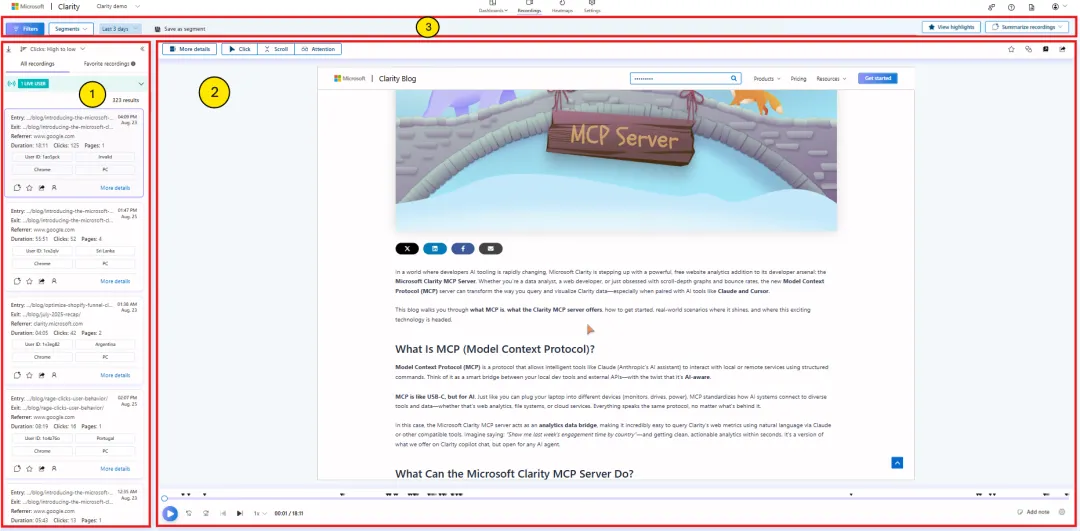 可以使用视频控件浏览录制内容。Clarity 还提供收藏、分享、添加标签和查看热图等功能,所有操作均可在同一屏幕上完成。 筛选器和区段(Filters and segments):