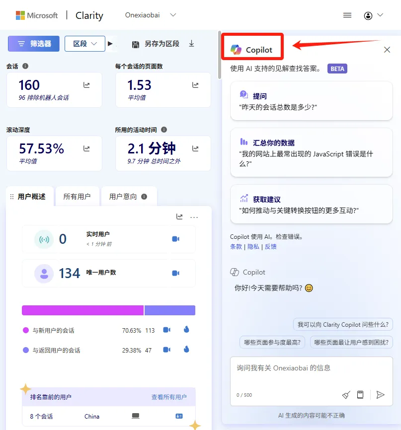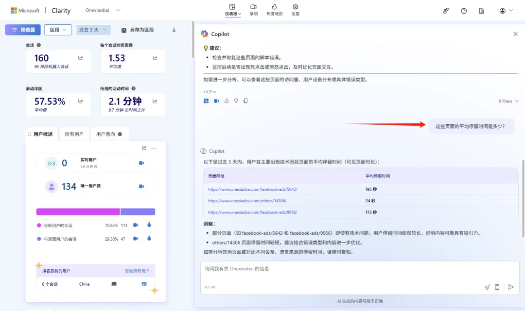 Clarity 利用 ChatGPT 内置的相同技术,并将其应用于你的网站数据,输入你需了解的问题,Copilot 就会根据其对你 Clarity 项目仪表板分析的理解生成回复。