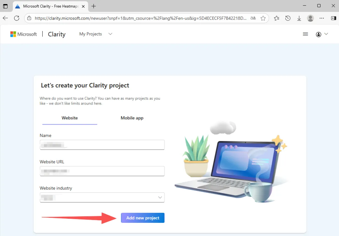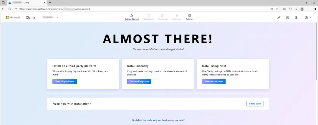 创建新项目后,接着还需要在网站上安装追踪代码才能开始使用 Clarity,