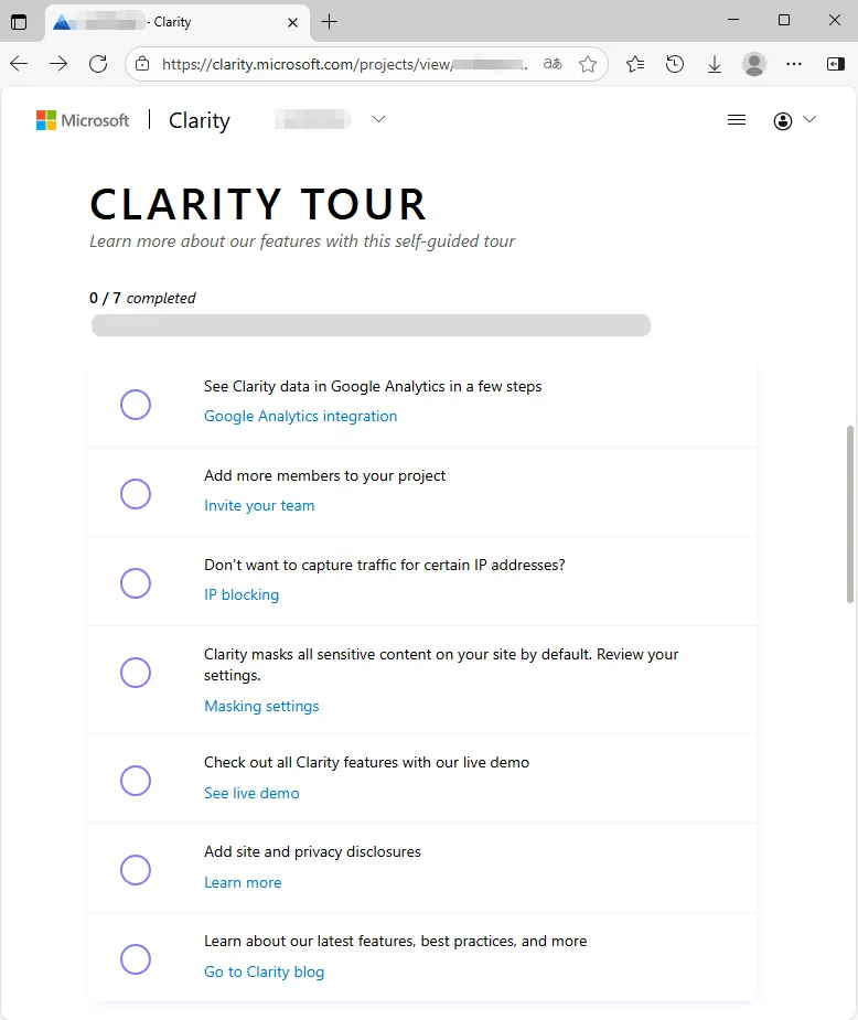 此外,项目设置完成后,向下滚动还会看到有一个 Clarity 导览(Clarity tour)清单,有助于你在完成设置时探索 Clarity 的功能。