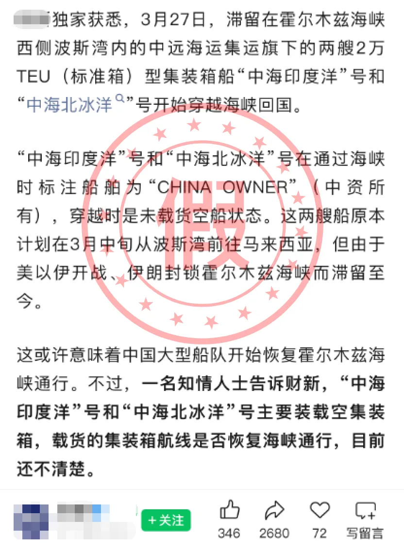 据了解,在该不实消息的报道中,原文是称:“3月27日,滞留在霍尔木兹海峡西侧波斯湾内的中远海运集运旗下的两艘2万TEU(标准箱)型集装箱船‘中海印度洋’号和‘中海北冰洋’号开始穿越海峡回国。”