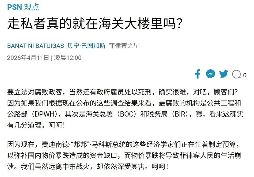 几天前,4月11日,菲律宾《星报》一篇评论文章的标题像一记耳光:《走私者真的就在海关内部吗?》文章没有点名,但字里行间都在追问一件事:为什么海关署长上台后大力反腐,严禁收贿、强制披露与报关行的利益关联——结果却是高层官员纷纷辞职?内部行政副局长费尔明走了,理由是"个人和安全原因";又一位"高层官员"走了,原因不明。改革的方向是对的,人却跑了。