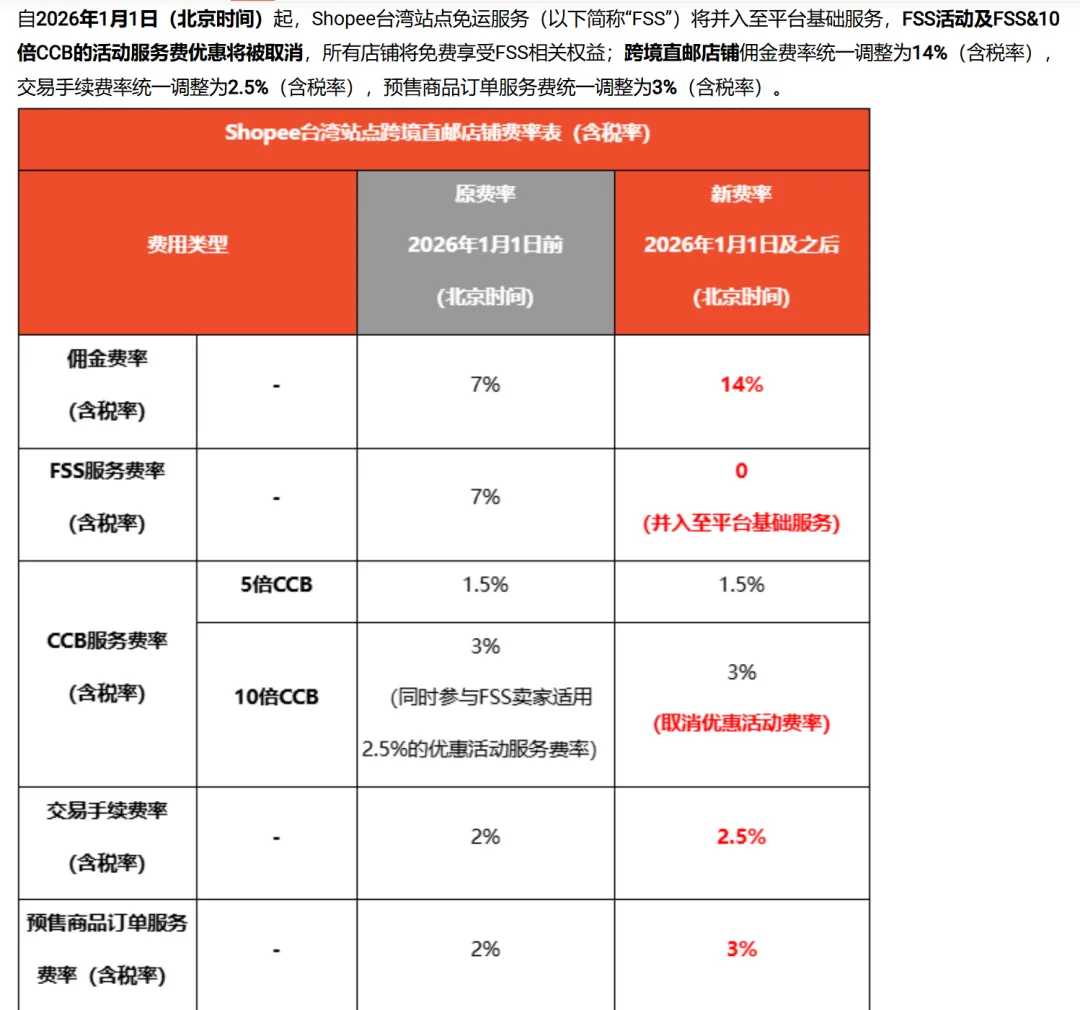 调整后:佣金费率 14%、交易手续费 2.5%、预售服务费 3%,同时原免运活动服务费优惠取消、新增物流渠道纳入免运范围。