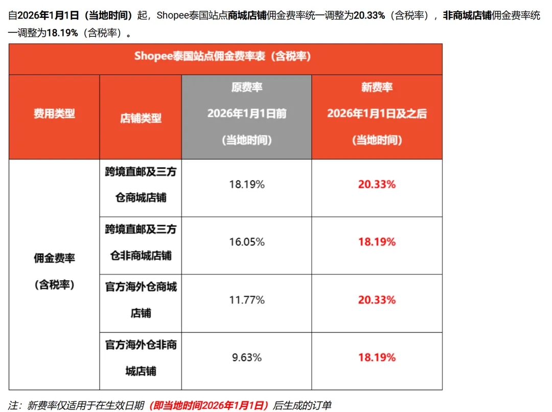 通知显示,Shopee自 2026 年 1 月 1 日起调整新加坡、马来西亚、泰国、越南、菲律宾及中国台湾地区站点的佣金、交易手续费等核心费率。各站点根据市场特性制定了差异化调整方案,主要集中在佣金费率优化,部分站点同步调整交易手续费及预售服务费。