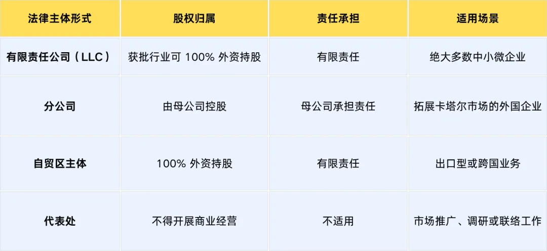 非自贸区的本土企业,通常需由卡塔尔籍合伙人持有 51% 股权;自贸区允许 100% 外资持股,因此深受外国投资者青睐。