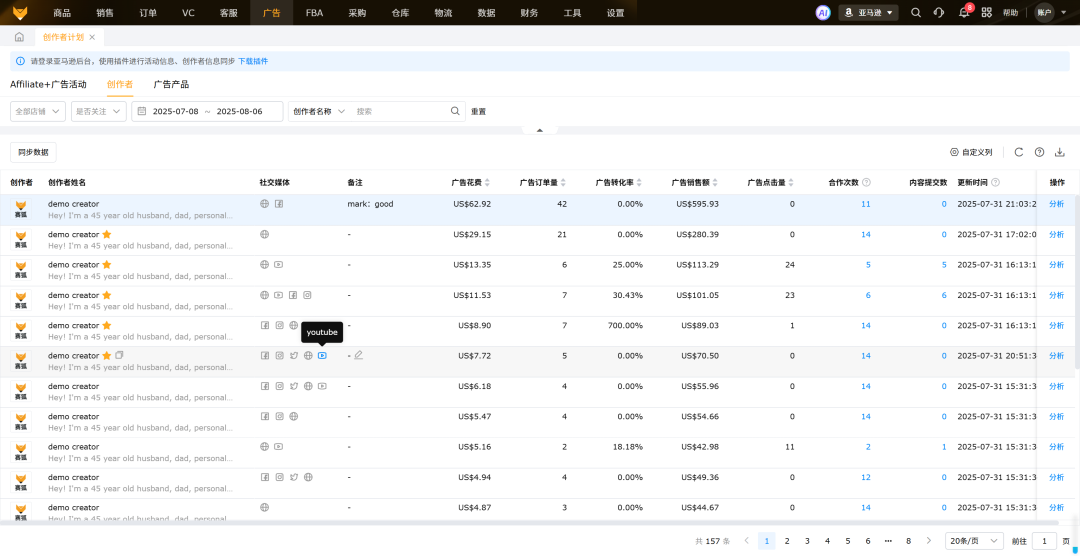 --表格化管理:建立共享表格,记录创作者姓名、联系方式、合作时间、内容链接、销售数据等,方便后续催稿、效果追踪与二次合作。也可以借助赛狐ERP的创作者计划管理功能,更加方便: