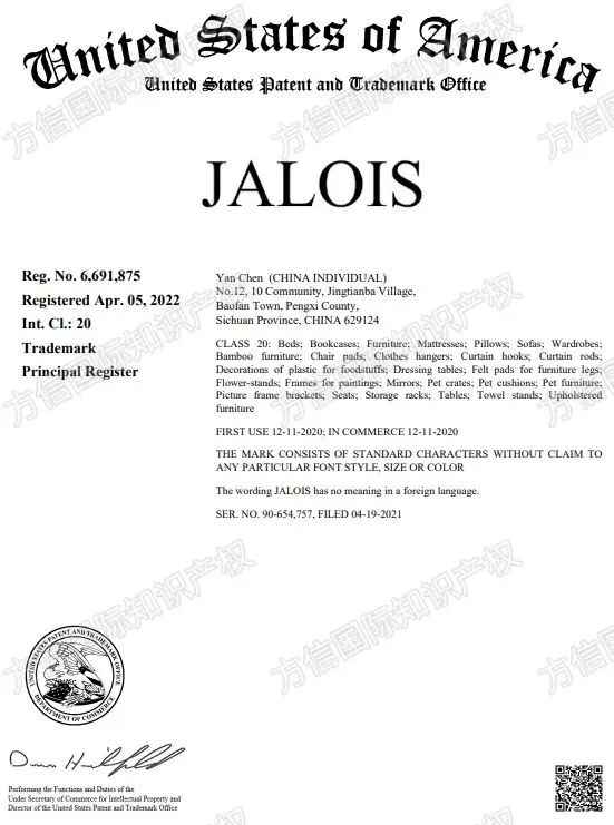 本案涉及商标维权,维权关键词:JALOIS;该商标注册于第20大类,覆盖家具、衣架、窗帘配件、食品用塑料装饰品、花架、镜子、宠物箱等多个细分家居用品领域。未经授权,切勿使用!
